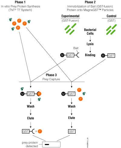 The MagneGST™ Pull-Down System provides GSH-linked magnetic particles that enable simple immobilization of bait proteins from bacterial lysates and an in vitro transcription/translation system for expressing prey proteins. The MagneGST™ Pull-Down protocol can be divided into three phases: 1) prey protein is expressed in the TnT® T7 Quick Coupled System; 2) bait protein present in crude E. coli lysate is immobilized on the MagneGST™ Particles; and 3) the prey protein is mixed with MagneGST™ Particles carrying the bait protein and captured through bait:prey interaction. Nonspecifically bound proteins are washed away, and the prey and bait proteins are eluted with SDS loading buffer. Prey proteins can be analyzed by SDS-PAGE and autoradiography if the prey protein was radioactively labeled during synthesis.