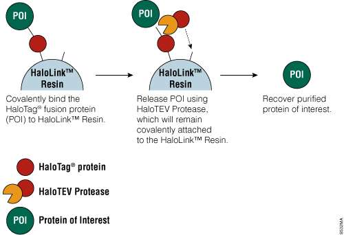 The HaloTag® Mammalian Protein Purification Systems (Cat.# G6795 and Cat.# G6790) use the HaloTag® protein tag, which can be genetically fused to any protein and transiently or stably expressed in mammalian cells. Following cell lysis, the HaloTag® fusion protein is covalently captured on the HaloLink™ Resin, and nonspecific proteins are washed away. The protein of interest is released by a specific proteolytic cleavage at an optimized TEV recognition site contained within the amino acid linker sequence that connects the HaloTag® protein tag and protein of interest. To eliminate the need for a secondary step to remove the protease, TEV protease fused to HaloTag® (HaloTEV Protease; Cat.# G6601) can be used to cleave the HaloTag® fusion protein and then covalently captured on the HaloLink™ Resin, resulting in a streamlined purification process. This straightforward purification uses a single, mild physiological buffer throughout the entire process with no need for buffer exchange.